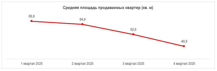 По итогам 4-го квартала средняя площадь реализованных квартир в сегменте бизнес-класса составила 49,9 кв. м, что почти на 6 кв. м ниже показателя 1-го квартала. При этом в текущем рыночном предложении средняя площадь квартиры уже достигает 60 кв. м. и, согласно действующим градостроительным нормативам и политике регулирования застройки, продолжит увеличиваться в 2026 году.